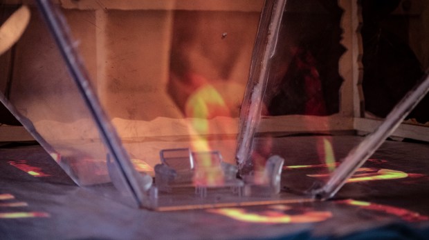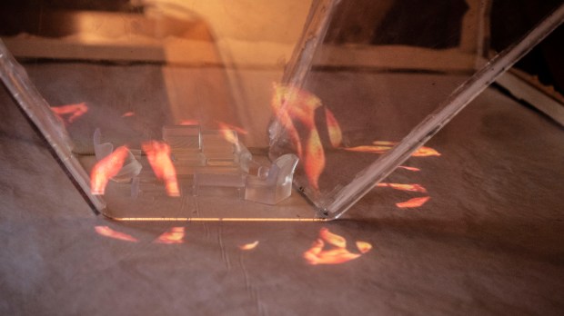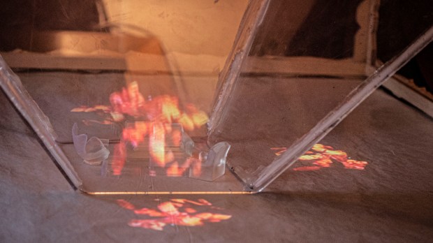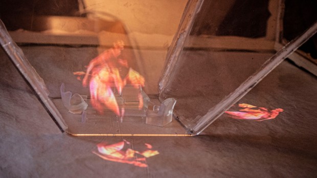 Interactive performance and installation, Holographic video projection, Plexi, 3D printed furniture, wood, cloth, and digital prints.