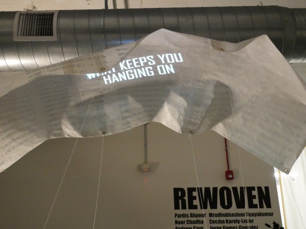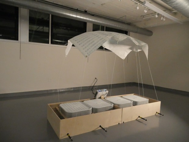 We Are All Just Hanging On, takes the answers to this question, shinning a beacon of light inside a parachute, tethered to metal poles that are being pushed up by wind generated by four box fans. Each sway of the chute, each pull of tension from the wind, jostling around this fragile piece of screen-printed paper is the representation of how fragile and delicate we are and how we are all doing our best to stay afloat against the winds of change and time.