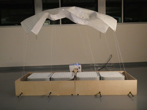 Wood, Screws, Screen-print on Thai Paper, Duct tape, metal pipes, twine, and projection. Dimensions: 8’ x 4’ x 6’