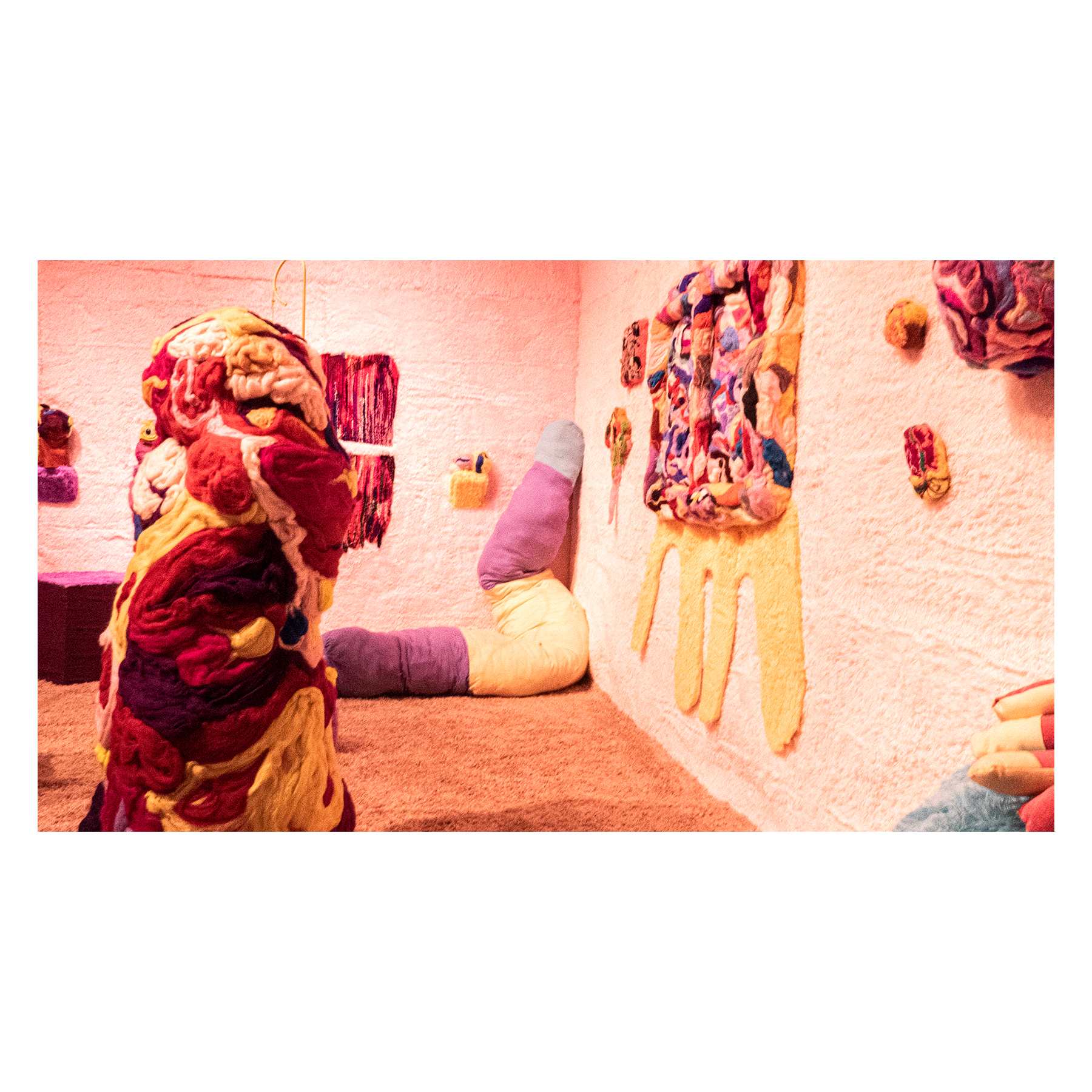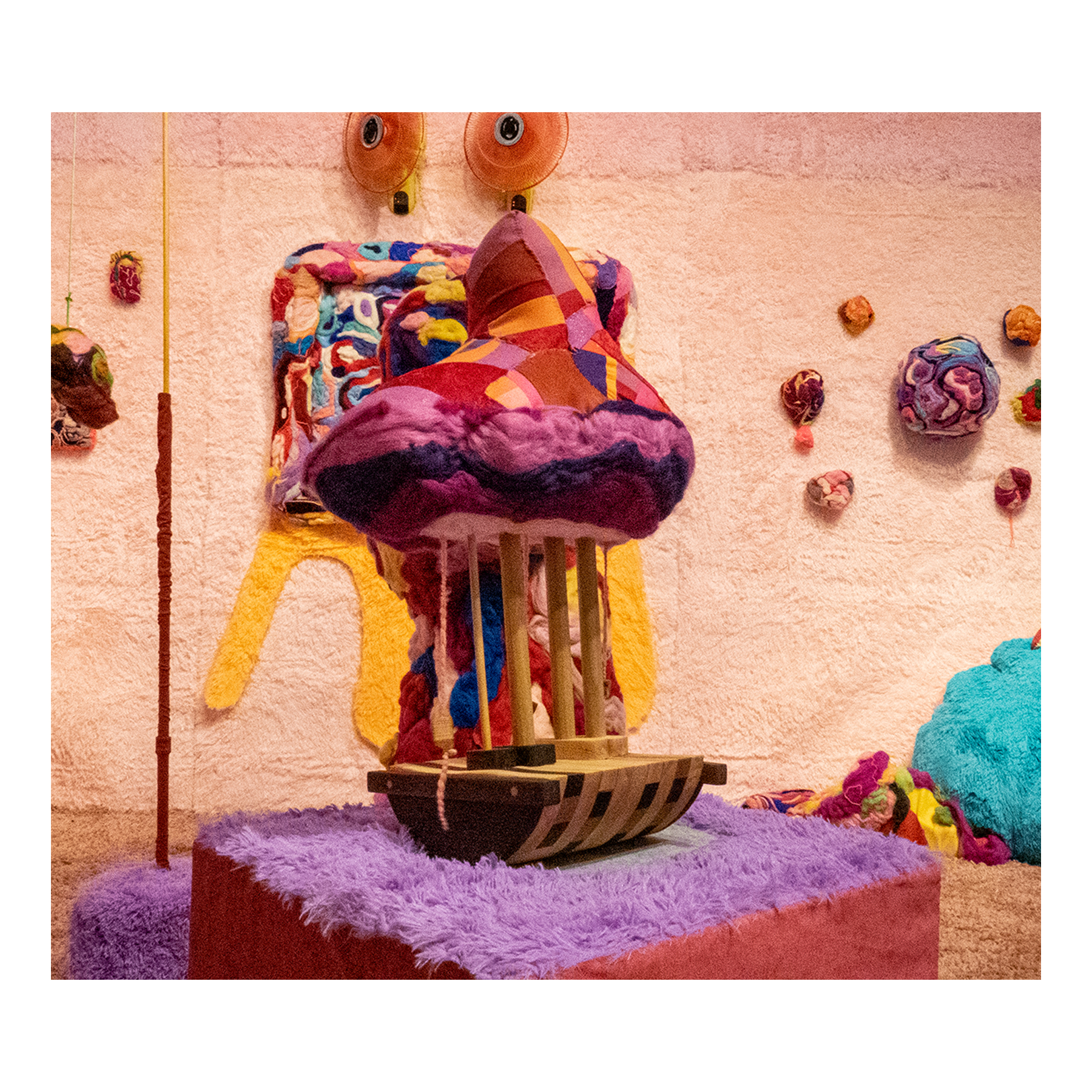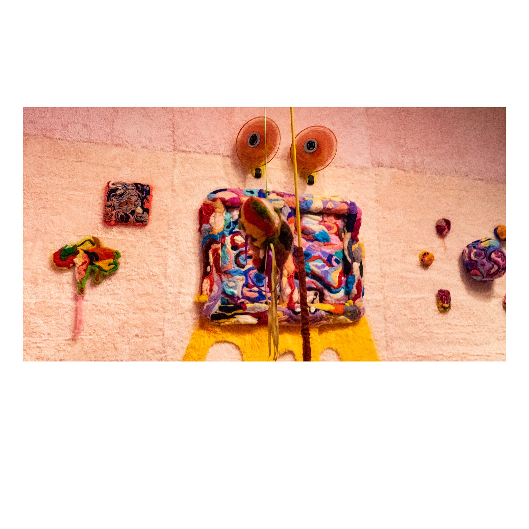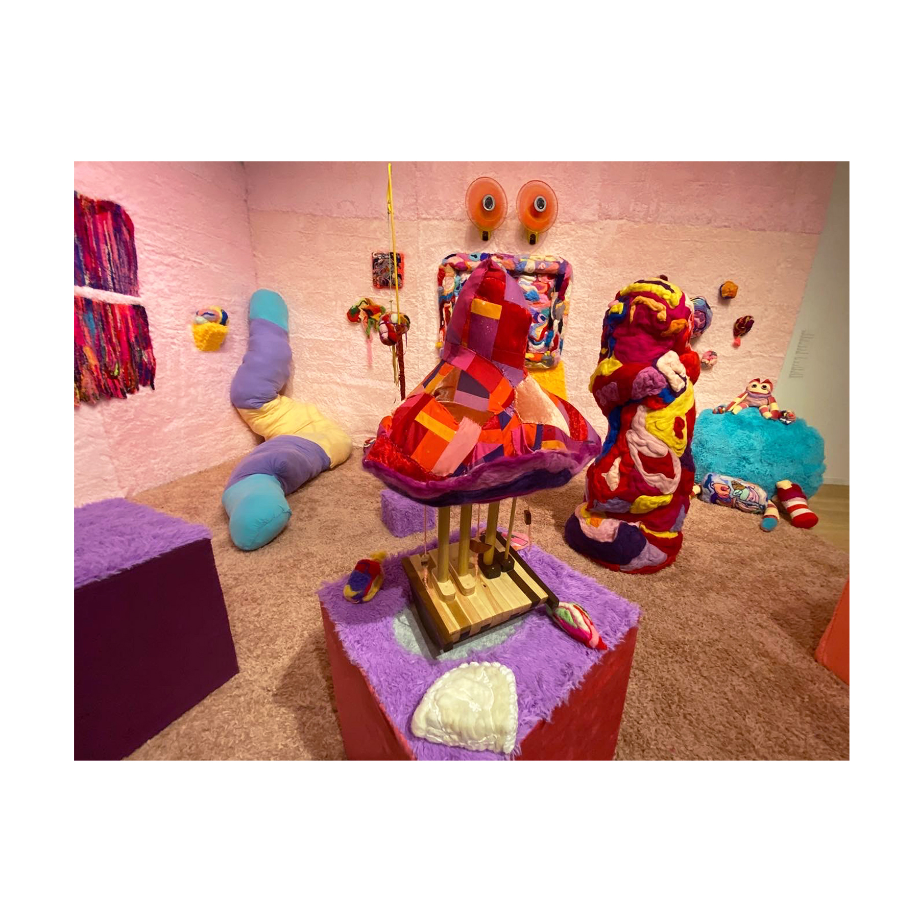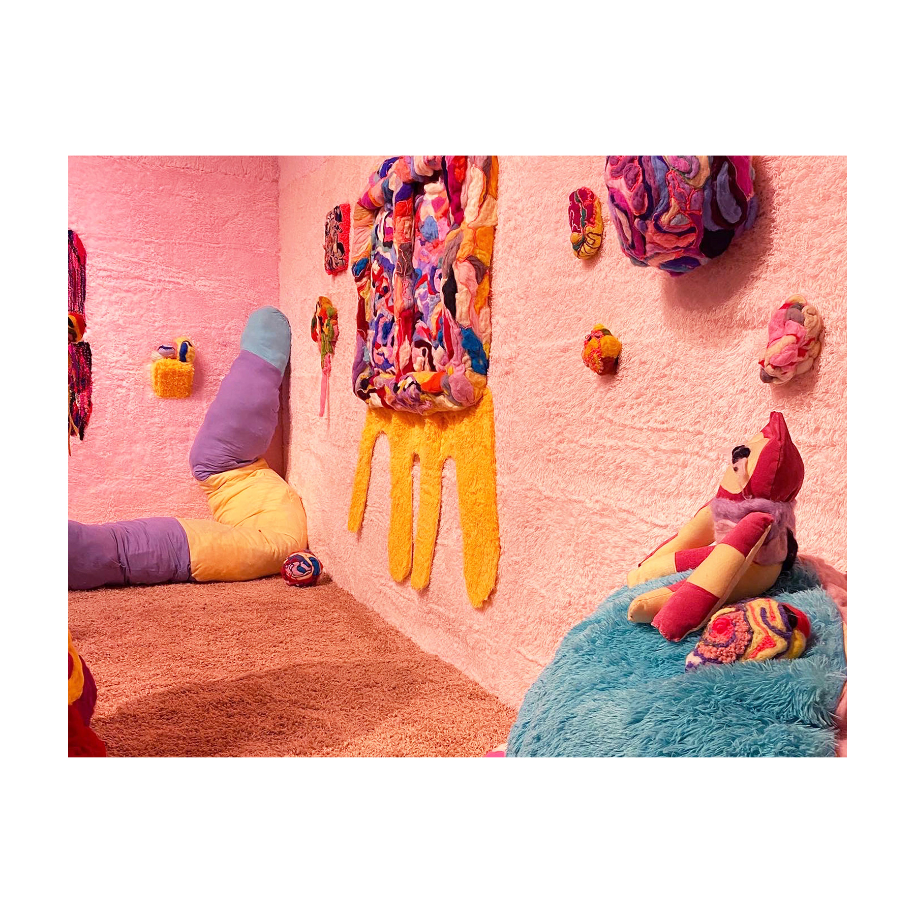 This series of work deals with the loss of touch that has been introduced to us during the pandemic. Our communities have been released from the zoom rooms and we have moved back into spaces that were vacated for the last two years. Being around each other has taken different forms as we continue to social distance and wear masks in public spaces but as we get closer and more acclimated to one another again what does affection look like in a world without touch? Our normal greetings with people from handshakes and hugs have become awkward fist bumps or elbow collisions, often awkwardly ending in confusion and uncertainty of connection. How we express comfortability with people or a hand on the shoulder or on the back to comfort them, has turned into air hugs or expressing apologies for a touch that was once usually welcomed by those we are close to. Steve Cole a behavioral Scientist and Psychiatrist from ULCA stated that “Touch is the most powerful safety signal of togetherness.” If this is true how do we feel safe together again, if we cannot feel safe touching each other to send these signals, can we transfer these signals to objects? Can we create spaces that allow us to touch to feel things in rooms with each other to recreate this feeling of togetherness, can our comfort with things compare or help us feel safe with each other again? These innards are brightly colored or paired with objects that are made to be touched, to be carried to be fiddled around with, giving the viewers and participants in touch the feeling of safety, of belonging, of being together in a space where it is safe to touch, to feel, to hug. This transference of feeling and safety is me offering myself to the viewer to invite them to feel safe again in a space with others, and though we may not be able to physically or mentally ready to touch each other just yet, these objects may be used as a substitution until we are able to without anxiety, repulsion, or fear of touch, once again, embrace feeling physically in a safe and meaningful way as we used too.