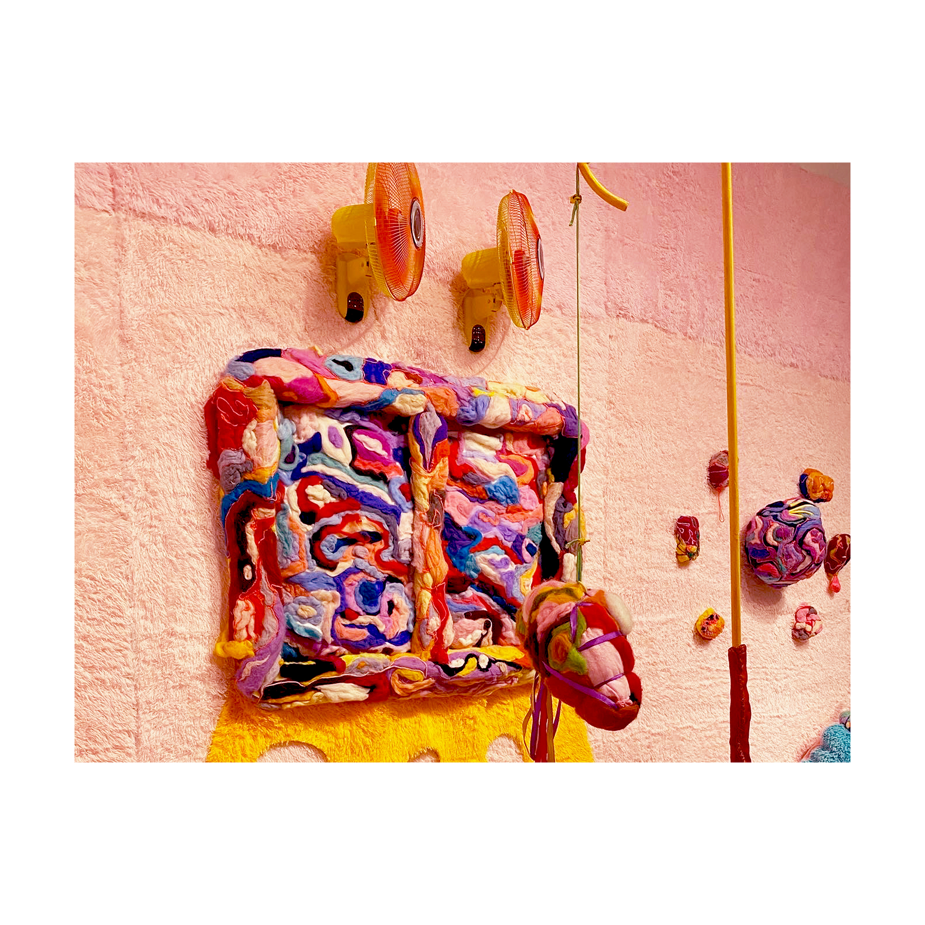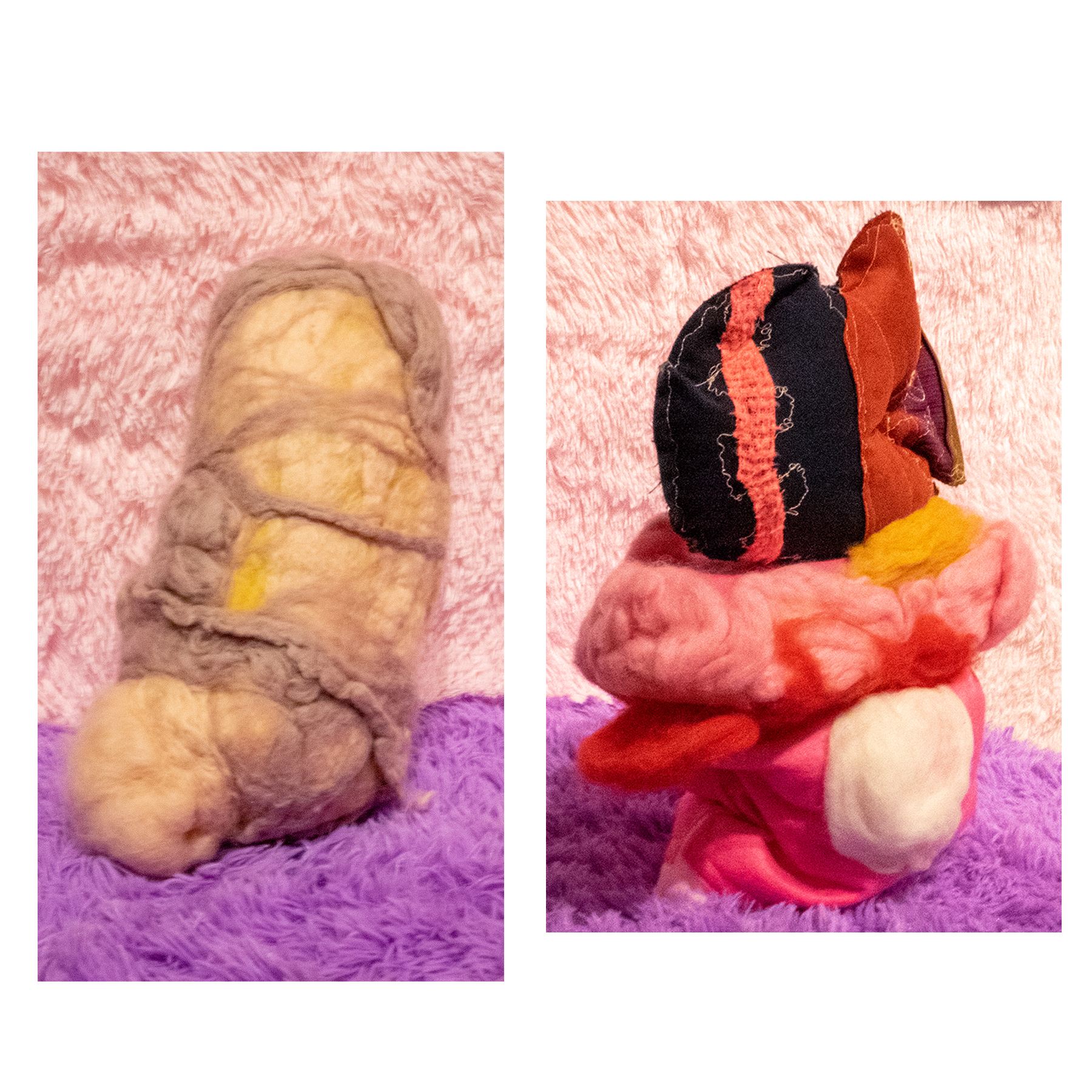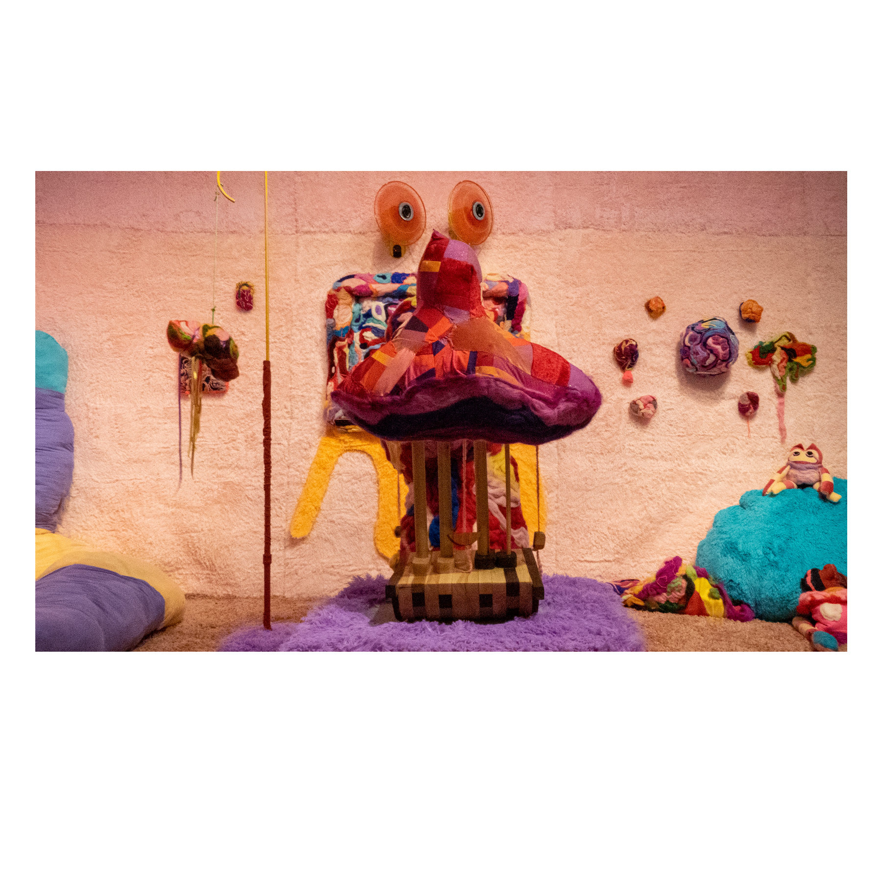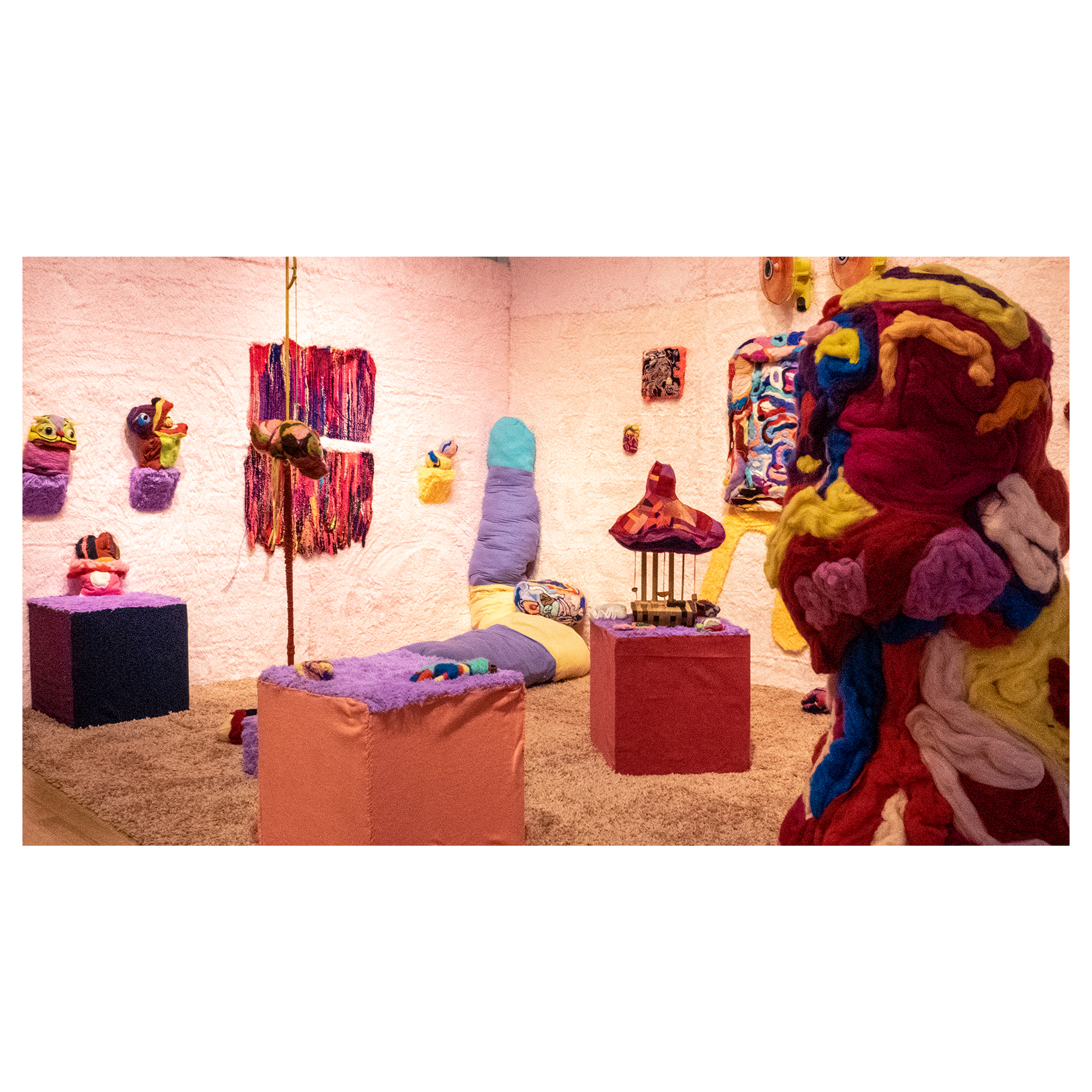 This series of work deals with the loss of touch that has been introduced to us during the pandemic. Our communities have been released from the zoom rooms and we have moved back into spaces that were vacated for the last two years. Being around each other has taken different forms as we continue to social distance and wear masks in public spaces but as we get closer and more acclimated to one another again what does affection look like in a world without touch? Our normal greetings with people from handshakes and hugs have become awkward fist bumps or elbow collisions, often awkwardly ending in confusion and uncertainty of connection. How we express comfortability with people or a hand on the shoulder or on the back to comfort them, has turned into air hugs or expressing apologies for a touch that was once usually welcomed by those we are close to. Steve Cole a behavioral Scientist and Psychiatrist from ULCA stated that “Touch is the most powerful safety signal of togetherness.” If this is true how do we feel safe together again, if we cannot feel safe touching each other to send these signals, can we transfer these signals to objects? Can we create spaces that allow us to touch to feel things in rooms with each other to recreate this feeling of togetherness, can our comfort with things compare or help us feel safe with each other again? These innards are brightly colored or paired with objects that are made to be touched, to be carried to be fiddled around with, giving the viewers and participants in touch the feeling of safety, of belonging, of being together in a space where it is safe to touch, to feel, to hug. This transference of feeling and safety is me offering myself to the viewer to invite them to feel safe again in a space with others, and though we may not be able to physically or mentally ready to touch each other just yet, these objects may be used as a substitution until we are able to without anxiety, repulsion, or fear of touch, once again, embrace feeling physically in a safe and meaningful way as we used too.