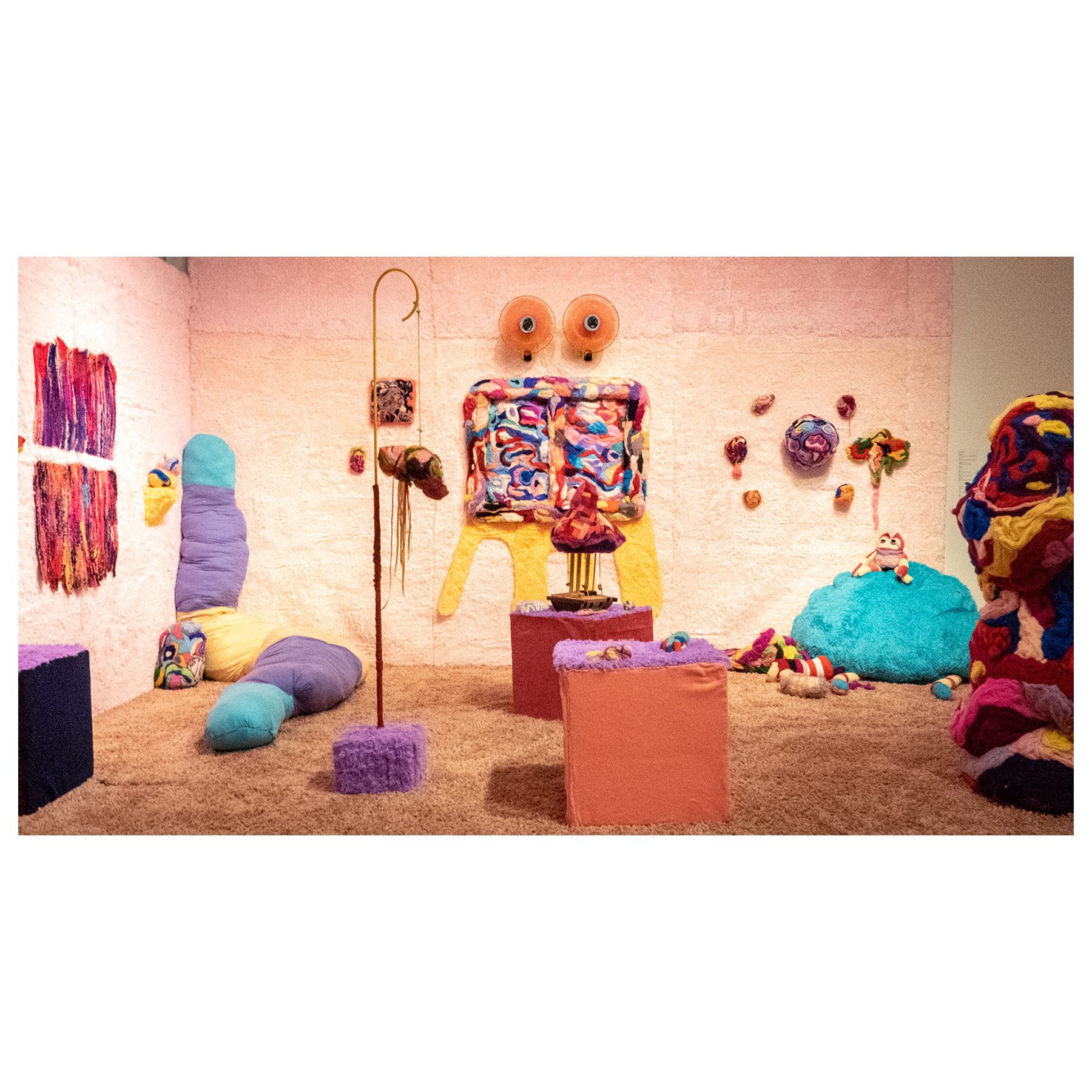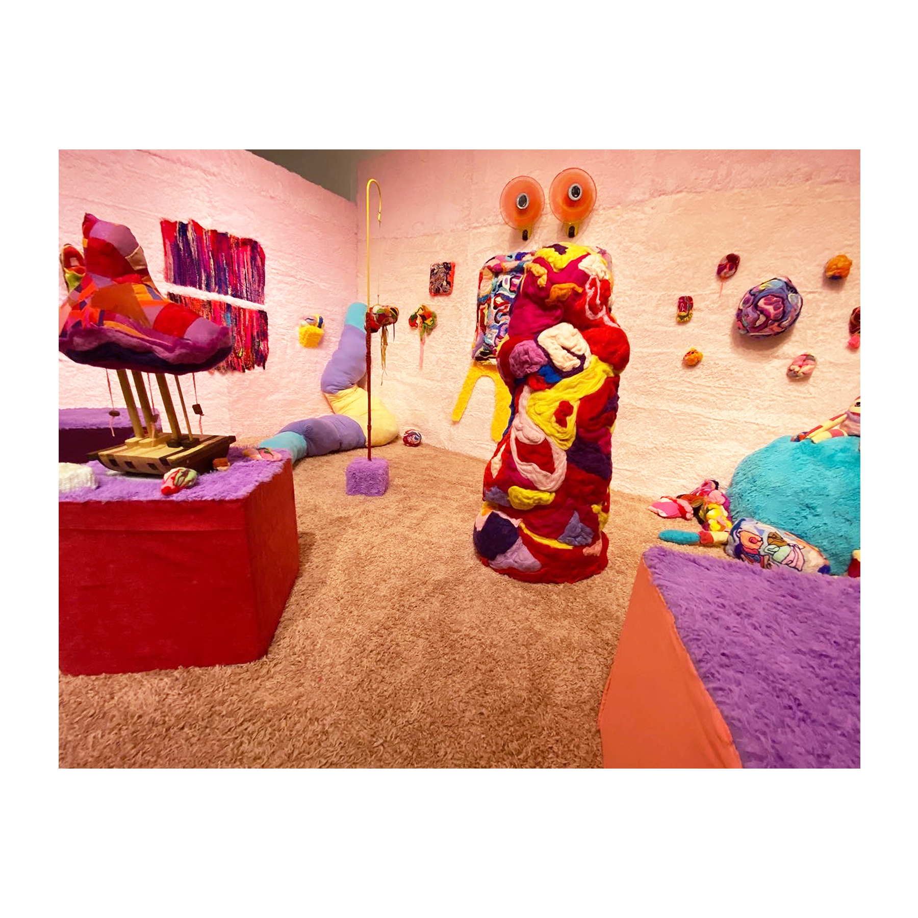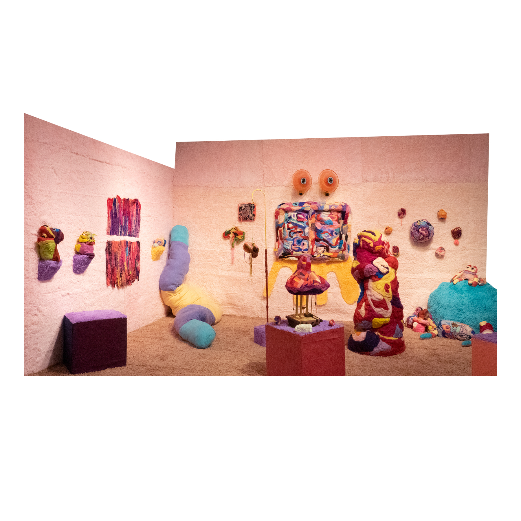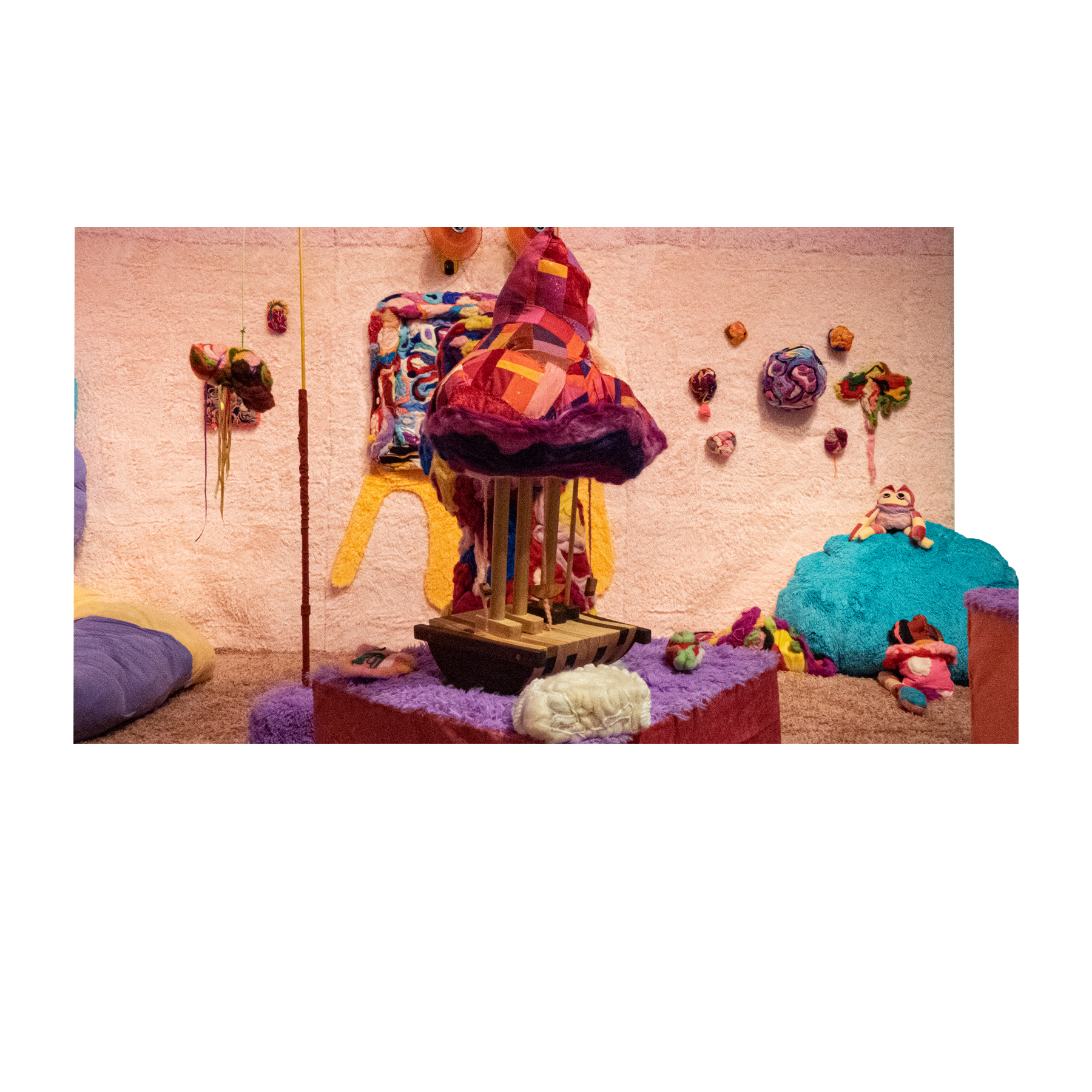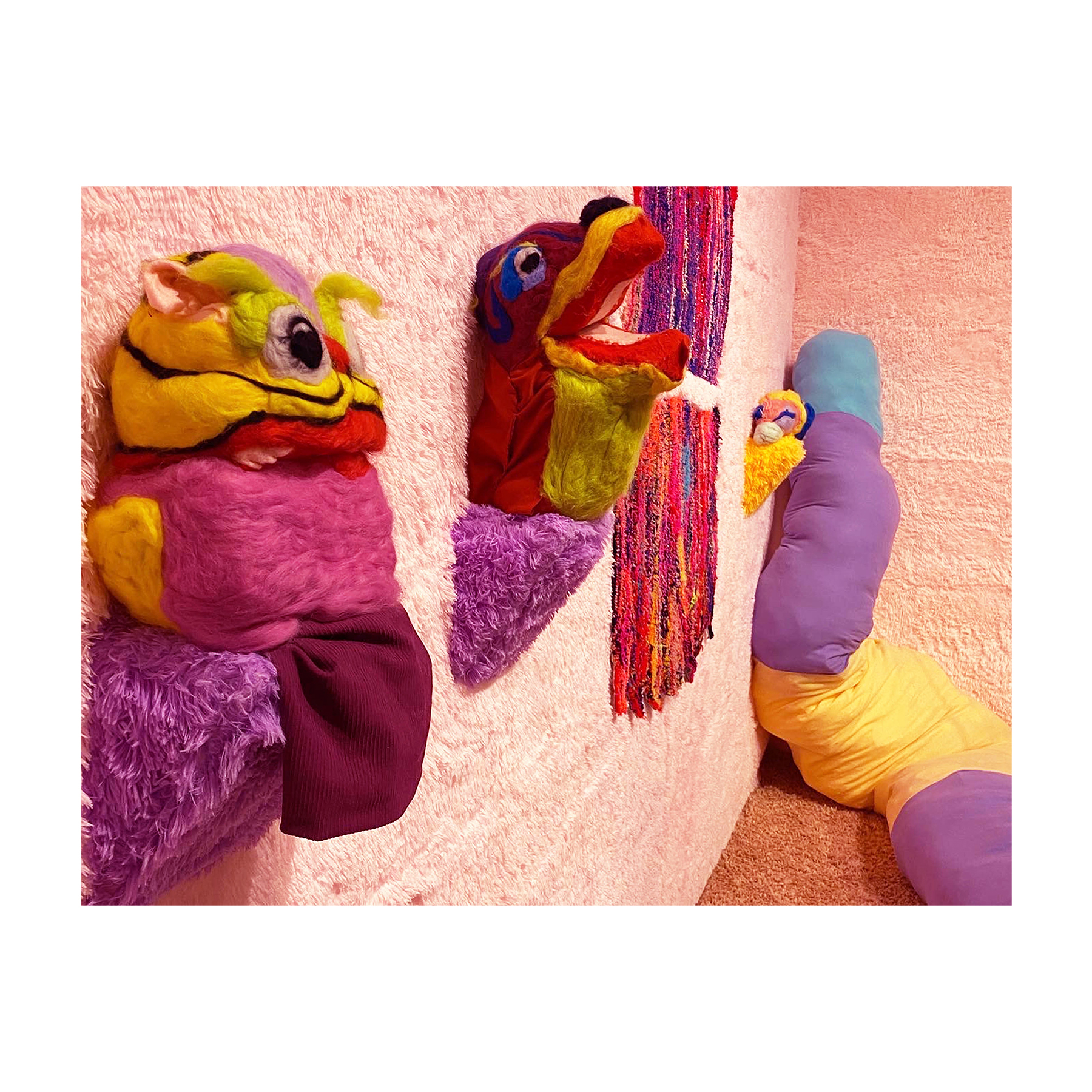 This series of work deals with the loss of touch that has been introduced to us during the pandemic. Our communities have been released from the zoom rooms and we have moved back into spaces that were vacated for the last two years. Being around each other has taken different forms as we continue to social distance and wear masks in public spaces but as we get closer and more acclimated to one another again what does affection look like in a world without touch? Our normal greetings with people from handshakes and hugs have become awkward fist bumps or elbow collisions, often awkwardly ending in confusion and uncertainty of connection. How we express comfortability with people or a hand on the shoulder or on the back to comfort them, has turned into air hugs or expressing apologies for a touch that was once usually welcomed by those we are close to. Steve Cole a behavioral Scientist and Psychiatrist from ULCA stated that “Touch is the most powerful safety signal of togetherness.” If this is true how do we feel safe together again, if we cannot feel safe touching each other to send these signals, can we transfer these signals to objects? Can we create spaces that allow us to touch to feel things in rooms with each other to recreate this feeling of togetherness, can our comfort with things compare or help us feel safe with each other again? These innards are brightly colored or paired with objects that are made to be touched, to be carried to be fiddled around with, giving the viewers and participants in touch the feeling of safety, of belonging, of being together in a space where it is safe to touch, to feel, to hug. This transference of feeling and safety is me offering myself to the viewer to invite them to feel safe again in a space with others, and though we may not be able to physically or mentally ready to touch each other just yet, these objects may be used as a substitution until we are able to without anxiety, repulsion, or fear of touch, once again, embrace feeling physically in a safe and meaningful way as we used too.