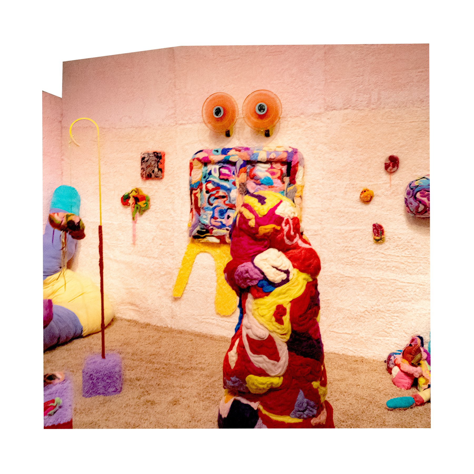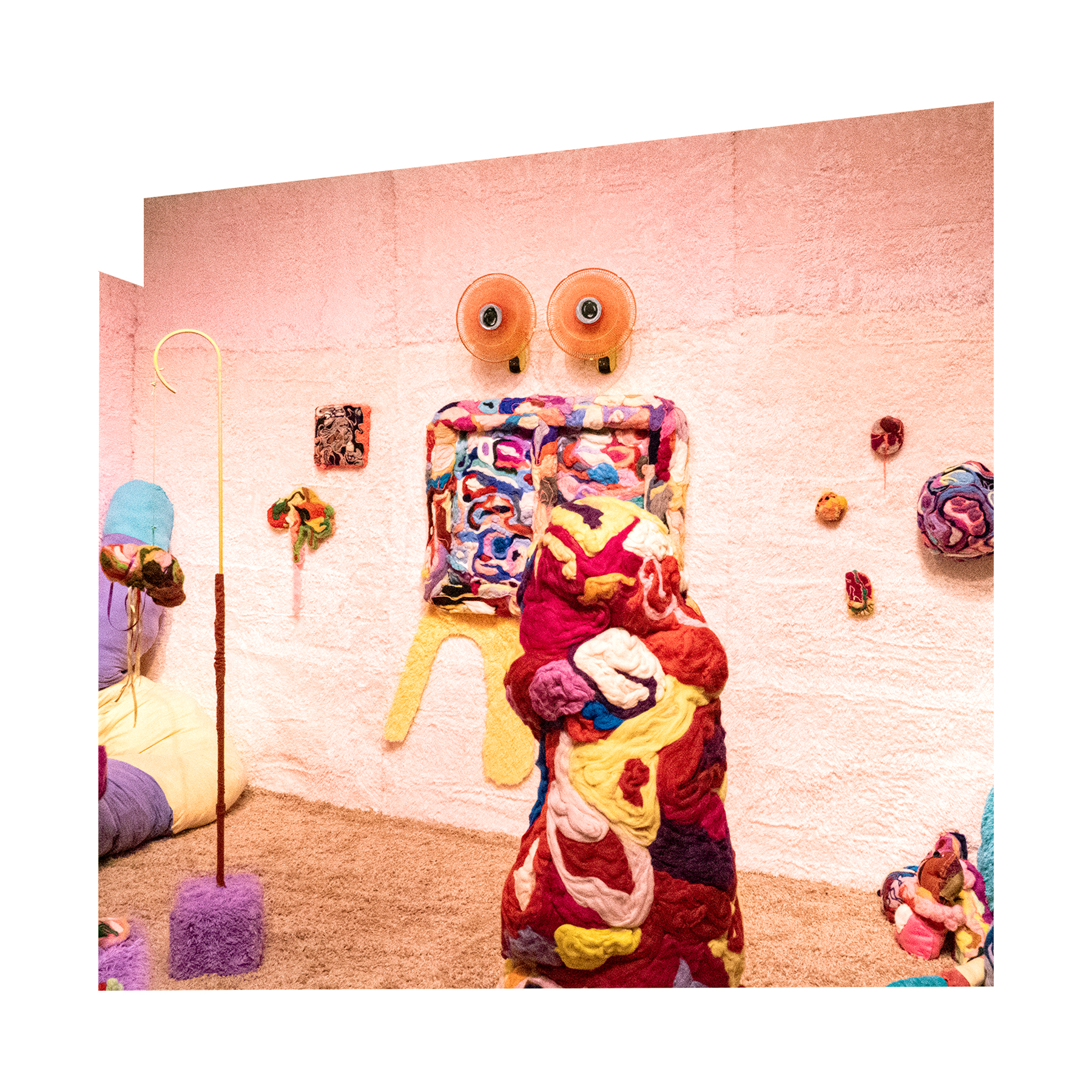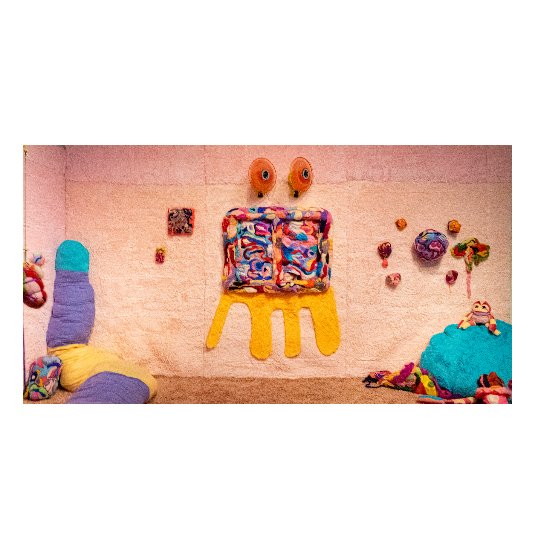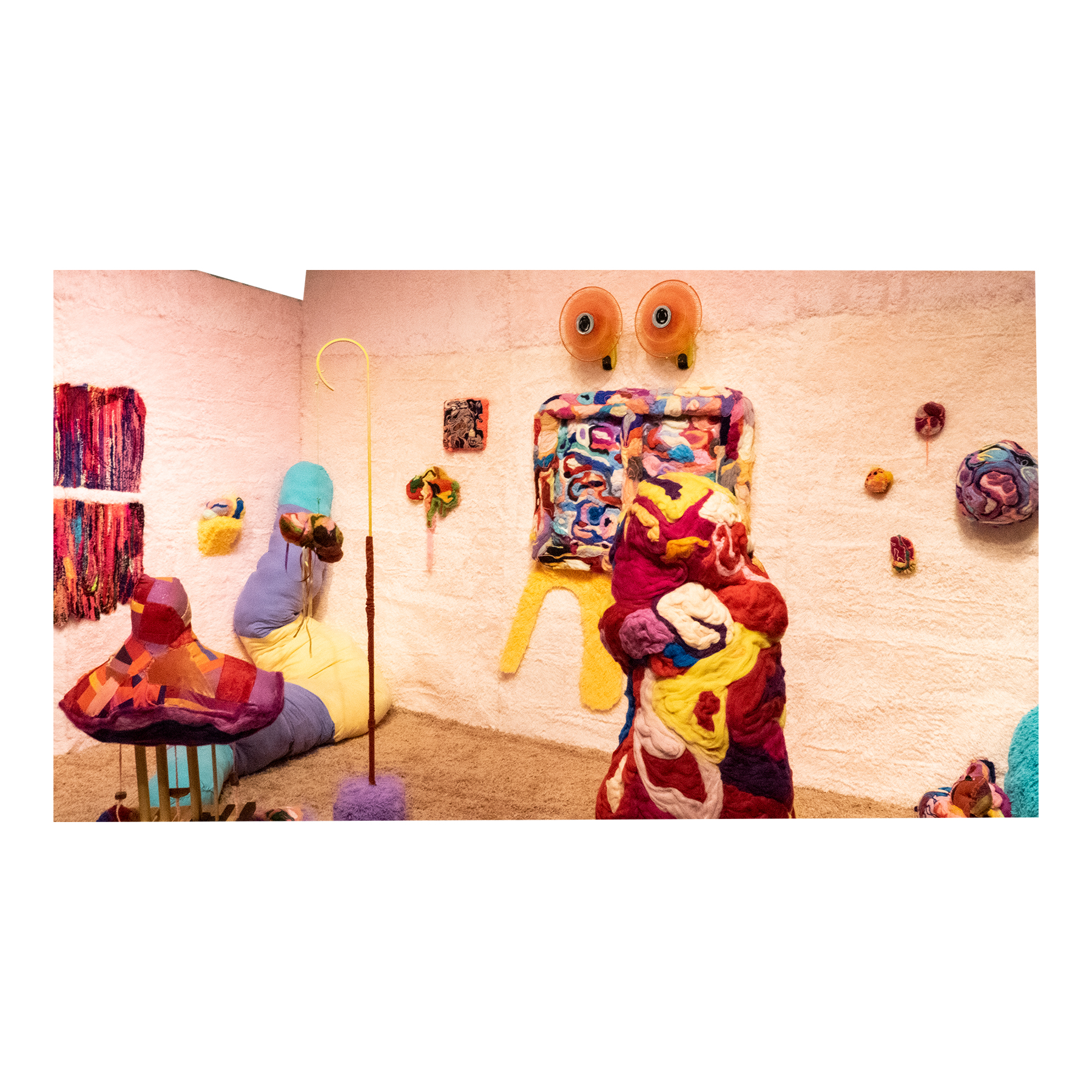 This series of work deals with the loss of touch that has been introduced to us during the pandemic. Our communities have been released from the zoom rooms and we have moved back into spaces that were vacated for the last two years. Being around each other has taken different forms as we continue to social distance and wear masks in public spaces but as we get closer and more acclimated to one another again what does affection look like in a world without touch? Our normal greetings with people from handshakes and hugs have become awkward fist bumps or elbow collisions, often awkwardly ending in confusion and uncertainty of connection. How we express comfortability with people or a hand on the shoulder or on the back to comfort them, has turned into air hugs or expressing apologies for a touch that was once usually welcomed by those we are close to. Steve Cole a behavioral Scientist and Psychiatrist from ULCA stated that “Touch is the most powerful safety signal of togetherness.” If this is true how do we feel safe together again, if we cannot feel safe touching each other to send these signals, can we transfer these signals to objects? Can we create spaces that allow us to touch to feel things in rooms with each other to recreate this feeling of togetherness, can our comfort with things compare or help us feel safe with each other again? These innards are brightly colored or paired with objects that are made to be touched, to be carried to be fiddled around with, giving the viewers and participants in touch the feeling of safety, of belonging, of being together in a space where it is safe to touch, to feel, to hug. This transference of feeling and safety is me offering myself to the viewer to invite them to feel safe again in a space with others, and though we may not be able to physically or mentally ready to touch each other just yet, these objects may be used as a substitution until we are able to without anxiety, repulsion, or fear of touch, once again, embrace feeling physically in a safe and meaningful way as we used too.
