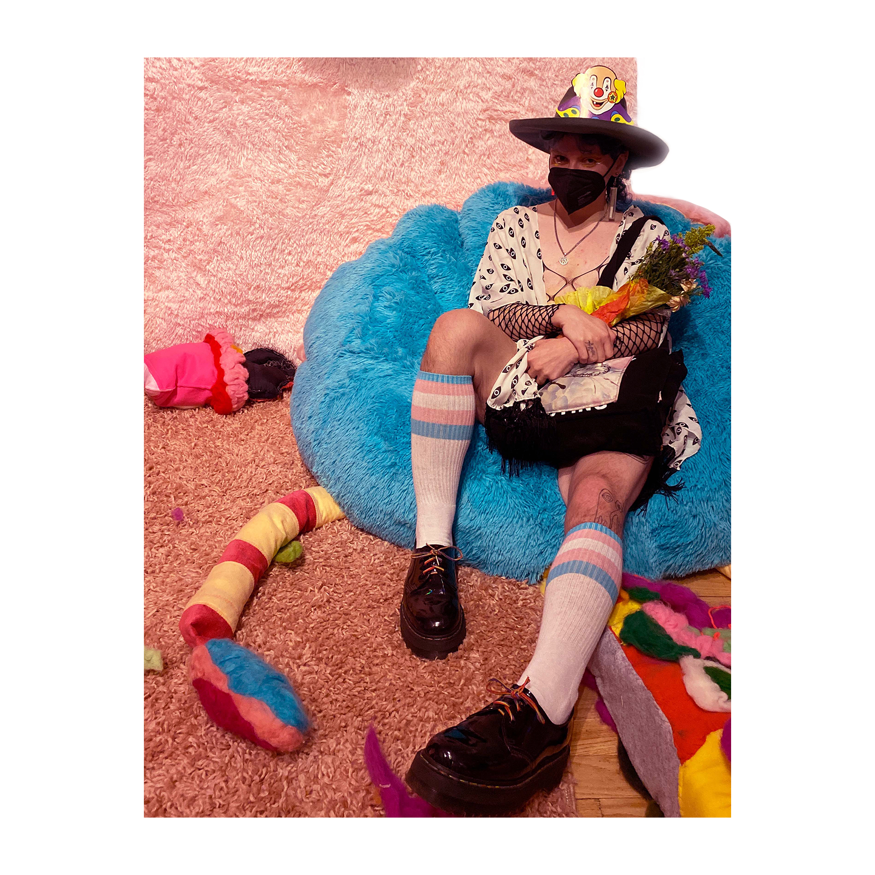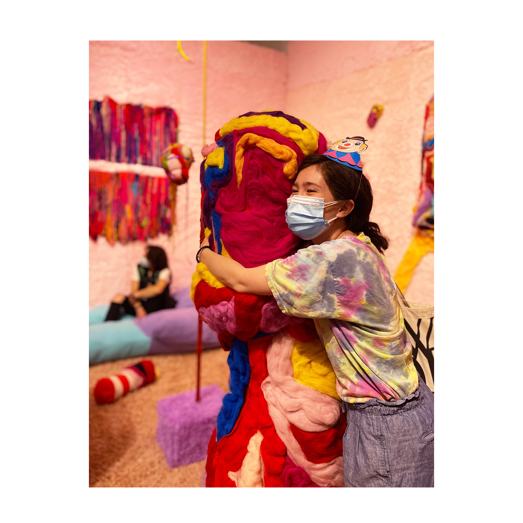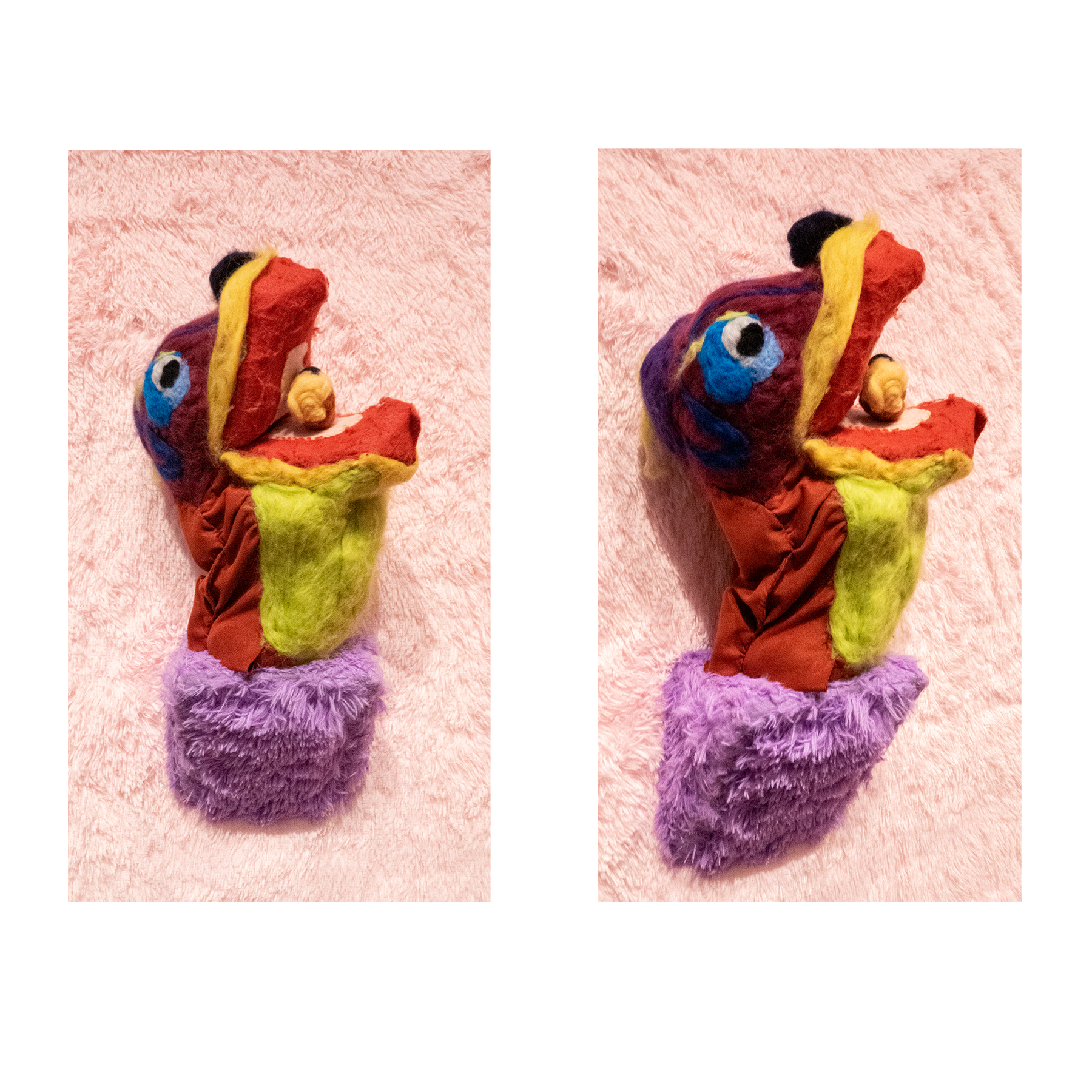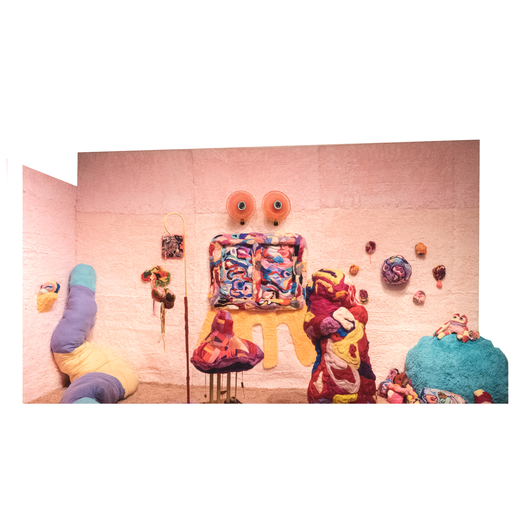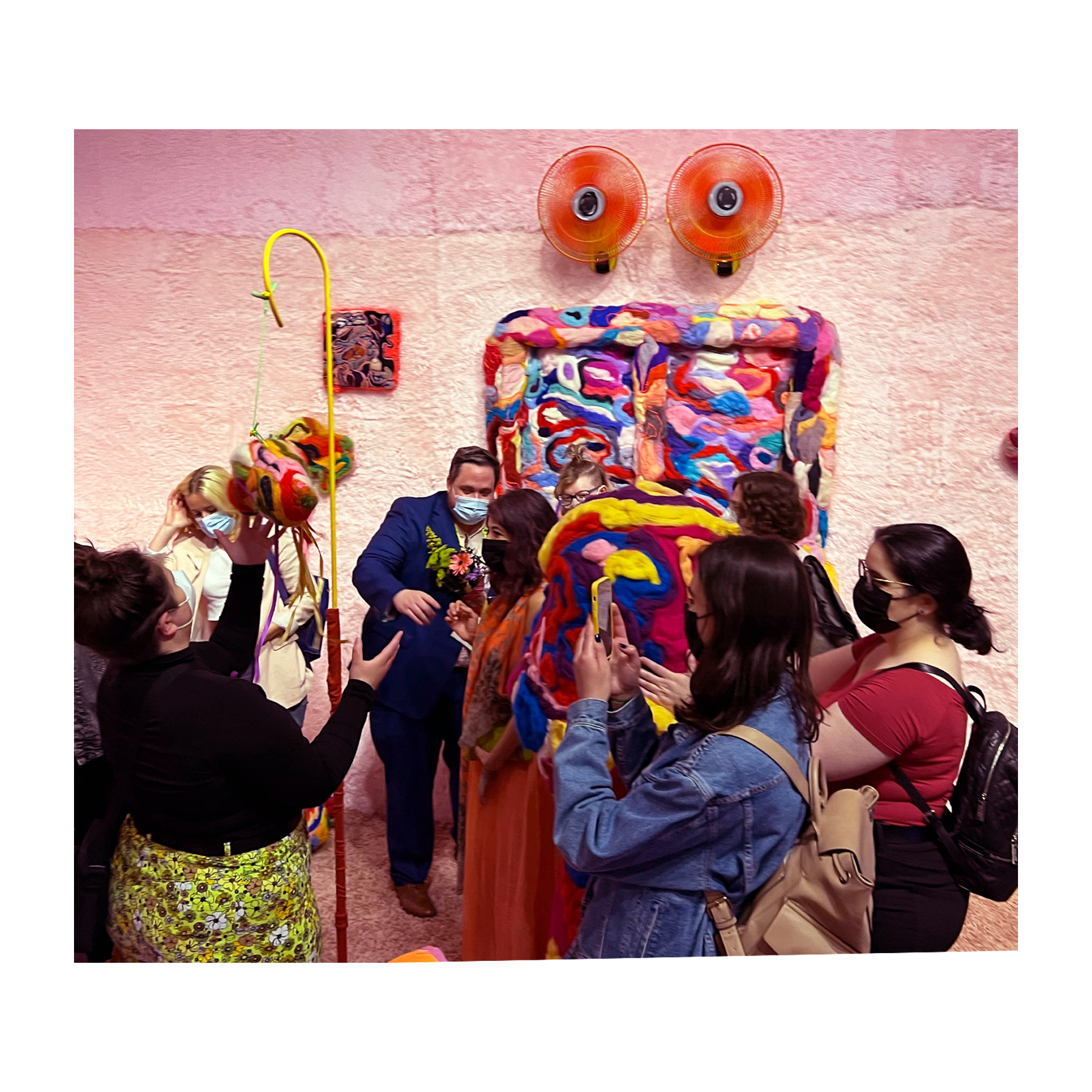 This series of work deals with the loss of touch that has been introduced to us during the pandemic. Our communities have been released from the zoom rooms and we have moved back into spaces that were vacated for the last two years. Being around each other has taken different forms as we continue to social distance and wear masks in public spaces but as we get closer and more acclimated to one another again what does affection look like in a world without touch? Our normal greetings with people from handshakes and hugs have become awkward fist bumps or elbow collisions, often awkwardly ending in confusion and uncertainty of connection. How we express comfortability with people or a hand on the shoulder or on the back to comfort them, has turned into air hugs or expressing apologies for a touch that was once usually welcomed by those we are close to. Steve Cole a behavioral Scientist and Psychiatrist from ULCA stated that “Touch is the most powerful safety signal of togetherness.” If this is true how do we feel safe together again, if we cannot feel safe touching each other to send these signals, can we transfer these signals to objects? Can we create spaces that allow us to touch to feel things in rooms with each other to recreate this feeling of togetherness, can our comfort with things compare or help us feel safe with each other again? These innards are brightly colored or paired with objects that are made to be touched, to be carried to be fiddled around with, giving the viewers and participants in touch the feeling of safety, of belonging, of being together in a space where it is safe to touch, to feel, to hug. This transference of feeling and safety is me offering myself to the viewer to invite them to feel safe again in a space with others, and though we may not be able to physically or mentally ready to touch each other just yet, these objects may be used as a substitution until we are able to without anxiety, repulsion, or fear of touch, once again, embrace feeling physically in a safe and meaningful way as we used too.