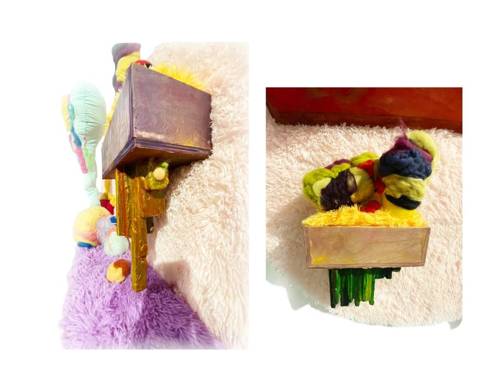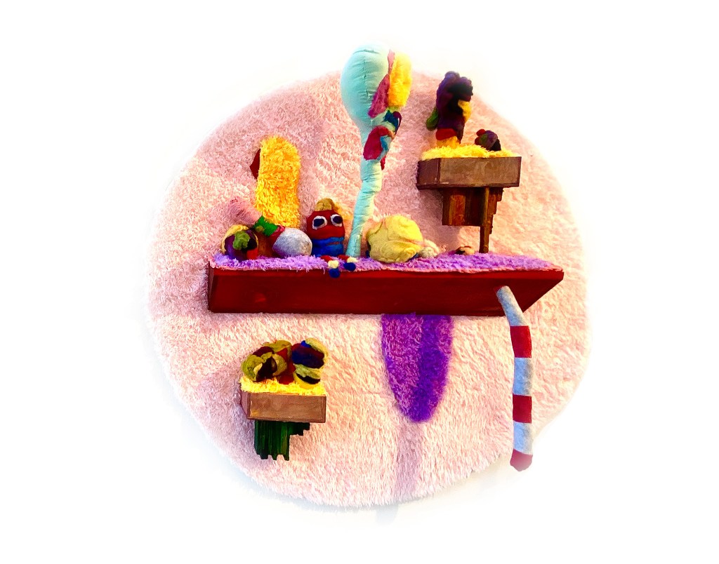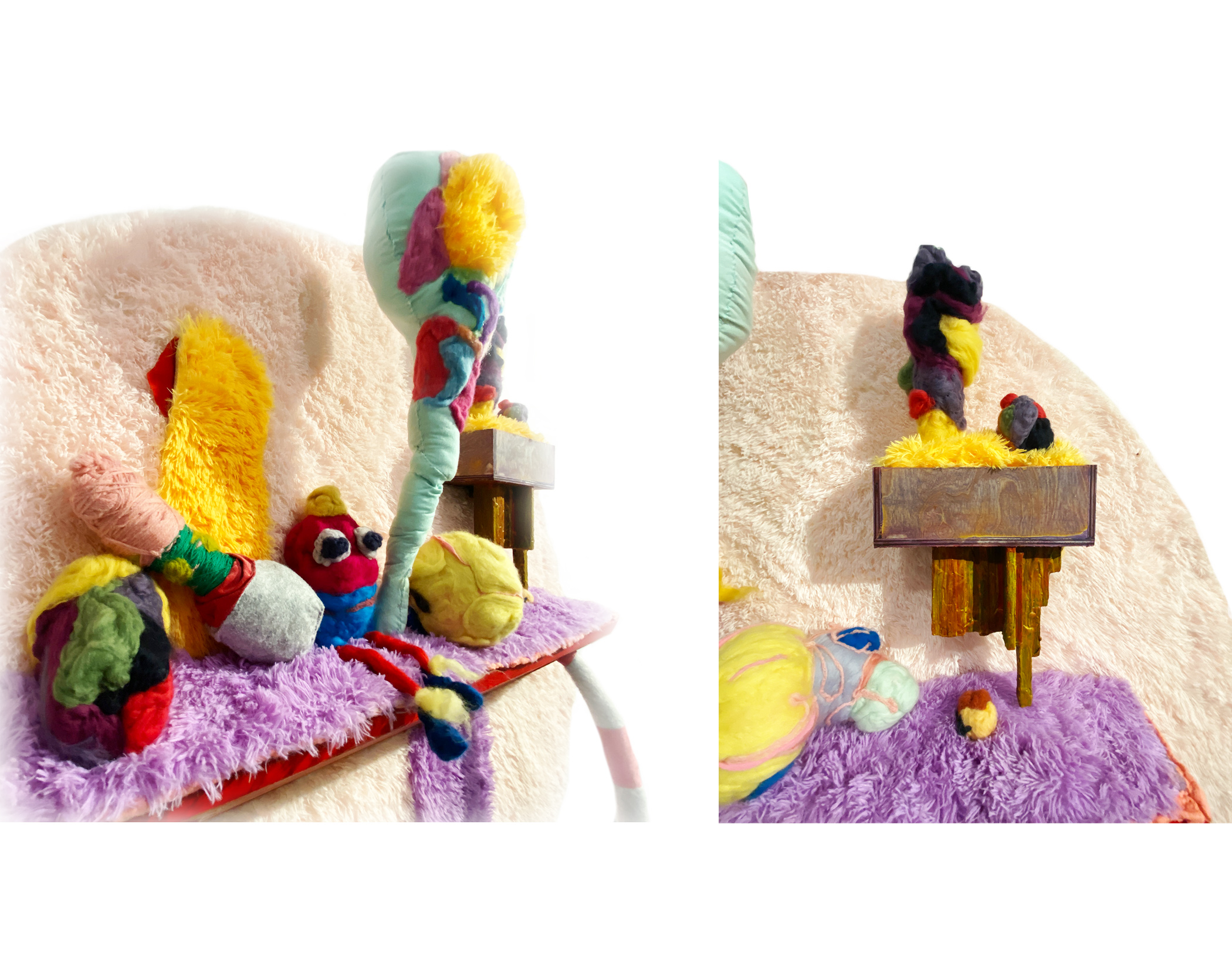 Medium: Needle Felted and Sewn Fleece, Foam, Expanding Foam, Wool, Wood, Metal Pipe, Poly Fill, Latex, Acrylic Paint, Carpet, and Milk Paint. 5′ x 5′ x 16″. 2022